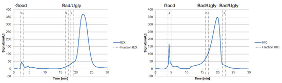 Chromatograms of an analytical IEX (left) and HIC (right) measurement of the diafiltrated cell-free CHO supernatant. The vertical sections represent the number of fractions taken, representing “Good”, “Bad,” and “Ugly” impurities.