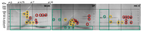 2D SDS-PAGE of the broth, diafiltrated broth (DF) and HIC fraction. Green circles represent “Good”, yellow circles “Bad,” and red circles “Ugly” HCP.
