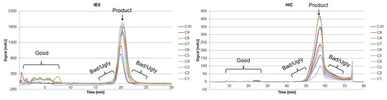 Proteins larger than 15 kDa have to be separated by another unit operation, which is based on other physicochemical properties (i.e., pI, hydrophobicity). Therefore, “Bad” and “Ugly” proteins possess a MW larger than 15 kDa. The horizontal line at 150 kDa represents the target protein in its functional condition. The vertical lines depict the isoelectric point at 4.75 and 7.0. Impurities with a pI of 4.75 can be subjected to a possible precipitation step using hydrochloric acid, which significantly reduces their concentration [42]. Those impurities exhibit a different pI than the target protein and can efficiently be separated by an IEX and are therefore classified as “Good.” Experimental IEX data show a distinctly different interaction with the stationary phase due to their surface charge distribution, as seen in Figure 9, which resemble the “Good” HCP. They elute near the void volume and can be easily separated. A similar train of thought can be conducted while characterizing the HIC chromatogram. As can be seen in Figure 9, the target product gets concentrated by each cycle in the iCCC mode.