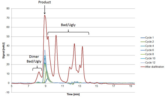 The 2D-PAGE analysis seen in Figure 8 is suitable for the visualization of the side component spectrum. However, the sample preparation requires reducing agents such as DTT, which destroys the protein’s structure by reducing the disulfide bonds. This preparation procedure results in spots on the gel, which do not resemble their native structure in the supernatant. Following the aforementioned classification and separation system, proteins with a MW lower than 15 kDa but with an isoelectric point near the target product will sometimes be classified as “Good” since they can be separated by filtration. Hence, the native protein can be “Ugly” even if it appears as “Good” in the gel (assuming no change in surface charge). Thus, it is of the utmost importance to use orthogonal analytical methods to validate the classification. In terms of MW, SEC analysis can be conducted in order to determine the size distribution of side components, as seen in Figure 10. The advantage of using SEC analysis is the determination of the side component’s native MW distribution as well as their qualitative mass in proportion to the product’s signal. The disadvantage is the less sensitive detection of low mass content side components as well as proteins resulting in a signal overlap with the mAb.