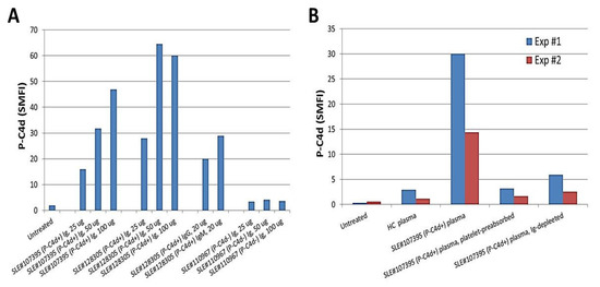 The capacity of autoantibodies in the plasma of SLE patients to active the complement system and induce C4d deposition of platelets was assessed in vitro. Briefly, platelet-rich plasma was prepared by centrifugation of EDTA-anticoagulated blood obtained from healthy volunteers or P-C4d-negative SLE patients, at 120× g for 10 min. Platelets were then collected and washed twice with PBS by centrifugation at 1600× g, in the presence of 1 g/mL of prostaglandin E1 (Sigma Aldrich, St. Louis, MO, USA). The resulting platelets were fixed with 0.5% paraformaldehyde in PBS for 20 min, washed once with PBS, and resuspended in PBS. Aliquots of platelet suspension were incubated with plasma samples (at 20% final concentration) prepared from selected SLE patients who had been identified as having positive P-C4d or high aPL serum levels. In some experiments, the SLE plasma was replaced with different amounts of purified IgG or IgM, Ig-depleted plasma, platelet-preabsorbed plasma, or commercially available human aCL antibody (Immunovision). After incubation at 4 °C for 45 min to allow autoantibody binding, the platelet samples were washed with PBS twice, resuspended in 50 µL of GVB2+ buffer (1% gelatin, 5 mM Na veronal, 142 mM NaCl, pH 7.3, containing Ca2+ and Mg2+), and incubated with 10 mL of normal human serum (as a source of complement). After incubation at 37 °C for 1 h to allow complement activation, the platelet suspensions were washed with PBS twice and subjected to P-C4d measurement by flow cytometry, as described above.