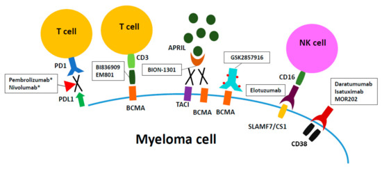 Monoclonal antibody-based treatments which provide additional effector cell-mediated tumor killing mechanisms when compared with targeted small molecules are successful therapeutic strategies for cancer. Monoclonal antibodies targeting specific surface antigens on cancer cells can kill the targeted cell via various effector-dependent and -independent mechanisms. Thus far, therapeutic IgG1-based monoclonal antibodies are designed to induce effector-mediated tumor cell lysis, including antibody-dependent cellular cytotoxicity (ADCC), complement-dependent cytotoxicity (CDC), and/or antibody-dependent phagocytosis (ADPC). Dependent on target antigens, therapeutic antibodies also act via receptor blockade to inhibit cell growth, induce apoptosis, or specifically deliver drug, radiation, or cytotoxic agent. Furthermore, the Fc region of antibodies plays an important role in mediating the killing of cancer cells via activation of certain immune cells (NK cells or cytotoxic T cells) as well as the induction of phagocytosis, CDC or ADCC [30,31]. For the treatment of hematological malignancies, the development of the anti-CD20 monoclonal antibody rituximab represents an important landmark and opened new venues for targeted cancer immunotherapies. Due to the success of rituximab in the treatment of B-cell lymphomas, the search for novel monoclonal antibodies for myeloma treatment has been rigorously pursued. Only small percentages of MM patients express CD20, so rituximab is not generally useful in myeloma [32,33]. Following the demonstration of promising preclinical and clinical activities [34,35,36], two monoclonal antibodies targeting CD38 (daratumumab) [37] and SLAMF7 (elotuzumab) [38] were approved by the Food and Drug Administration (FDA) to treat patients with relapsed and refractory multiple myeloma in late 2015.