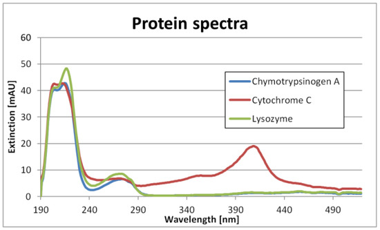 The test mixture contained Chymotrypsinogen A, Cytochrome C and Lysozyme. 10 mg of each protein were dissolved separately in 1-mL binding buffer, leading to three samples with a concentration of 10 g/L each. To identify the differences in UV/VIS spectra, 20 µL of each sample was injected onto the column and measured with the DAD detector at a certain peak height corresponding to 0.01 g/L.