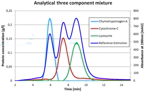 Now, the concentration is known for every time point of the chromatogram. Thus, the extinction coefficients ελ,i, are the only unknown variable left in Equation (2). In this work, Equation (2) was solved for the coefficients at a time point corresponding to 0.1 g/L protein concentration. This calibration has to be done for each protein.