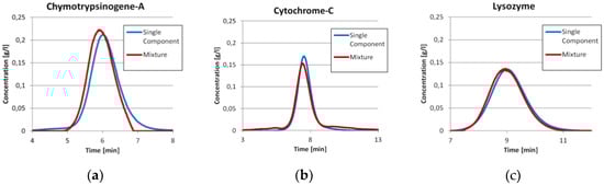 Prior to the injection of the three component mixture, the exact same amount of each component was injected separately as described earlier. The comparisons between the single component injections with the ICM peak of the same component in the three component run are shown in Figure 3. It can be seen that the Chymotrypsinogene-A peak in the mixture is pushed a little bit to an earlier elution. The mean residence time shifts from 6.07 min to 5.96 min. Although, the dilution front of this peak is sharper. This is in good agreement with the displacement theory of chromatography. The Cytochrome-C peak has mainly the same shape in both experiments, but tends to co-elute with both neighboring components slightly. The Lysozyme peak is in both cases more or less the same. For both later proteins, there are only minor changes in the residence time. All values are displayed in Table 1.