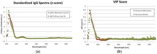 As mentioned before, eleven different ratios of IgG monomer and dimer were measured from which nine were used for the SIMPLS calibration and three for the validation. The corresponding UV/VIS spectra for the mixture with the highest and lowest monomer content are shown in Figure 5a. The spectra are standardized (z-score) to emphasize the differences. One statistic model was created to calculate both IgG monomer and dimer concentration at the same time as opposed to creating two models, one for each component. The Variable Importance on Projections (VIP) can be found in Figure 5b. Both Figure 5a,b show, that there are only minor differences in UV/VIS absorption for IgG monomer and dimer. The most important region is from 200 to 290 nm. This predication is supported by Figure 6a, which shows the loadings for each latent variable over wavelength. Again, the highest values are in the region from 200 to 290 nm. The region beyond 390 nm might be dominated by noise. Figure 6b shows the importance of each latent variable for the concentration results (Y-matrix). As expected, the first latent variables are the most important. But especially for the dimer concentration, variables 5 to 7 also show significant contribution.