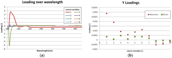(a) Loading over wavelength diagram for the first eight latent variables. The higher the absolute value, the more important is this wavelength for the latent variable; (b) loadings of the Y results over latent variables. The higher the absolute value, the higher is the importance of this latent variable for the concentration calculation of monomer or dimer respectively.