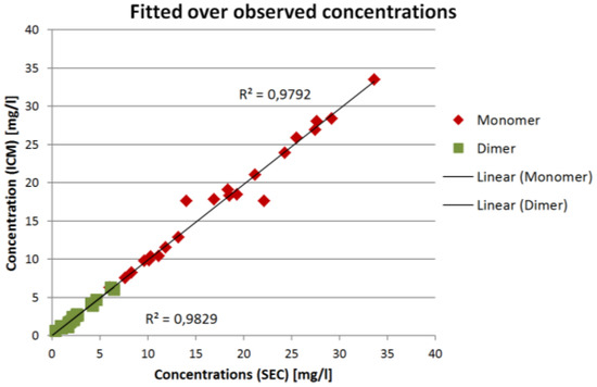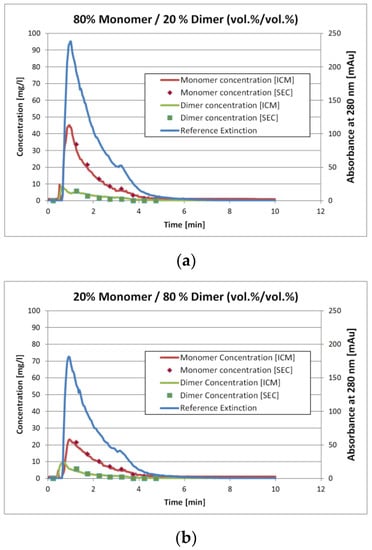 Figure 7a and Figure 4b show the results for two of the validation measurements. These experiments represent the injection of the sample with 80 vol.% monomer/20 vol.% dimer (Figure 4a) and 20 vol.% monomer/80 vol.% dimer (Figure 4b), respectively. Again, these numbers represent the volumetric mixing ratio of the SEC fractions as described earlier. Due to conversion of either monomer to dimer or vice versa the mixing ratio does not match the concentration ratio.