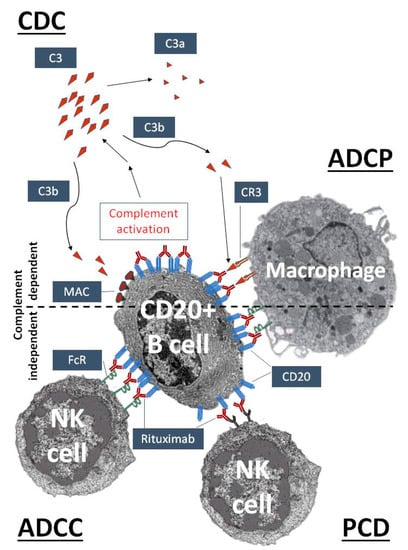 Complement activation as an essential mechanism of the therapeutic action of rituximab, an anti-CD20 antibody. Rituximab recognizes CD20 on the surface of pre- and mature B cells. After binding, the complement activation cascade is initiated by the classical pathway leading to the cleavage of C3 into C3a and C3b. C3b can cause complement-dependent cytotoxicity (CDC) by promoting the assembly of the membrane attack complex (MAC), while complement receptors on phagocytic cells, such as complement receptor type 3 (CR3) on macrophages, can mediate complement-enhanced antibody-dependent cell-mediated phagocytosis (ADCP). Surface-bound rituximab can trigger natural killer (NK) cells and macrophages by complement-independent mechanisms, via antibody-dependent cell-mediated cytotoxicity (ADCC), ADCP and, to a lesser degree, the induction of programmed cell death (PCD).