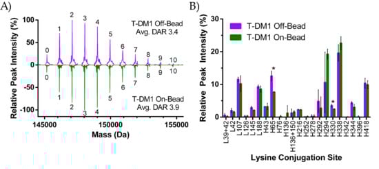 (A) Intact LC/MS analysis of deglycosylated T-DM1 Off-Bead (purple) and On-Bead (green). Integer values indicate the number of drugs per antibody found for that peak population as determined by the approximately 956 Da difference in mass between peaks. Average drug-to-antibody ratio (DAR) values are a weighted average of each DAR peak; (B) Relative peak intensity of conjugation sites following tryptic digestion for Off-Bead (purple) and On-Bead (green). An “L” denotes a lysine on the light chain while “H” indicates that the lysine is on the heavy chain. Samples were digested in triplicate from a single antibody–drug conjugate (ADC) batch for both Off-Bead and On-Bead prior to analysis. Conjugation sites are labeled on the x-axis with dual conjugated peptide sequences denoted with a “+” between the two sites. * indicates statistical significance between the conjugation site of Off-Bead and On-Bead (p ≤ 0.05). Standard deviation is represented by error bars above and below each data set.