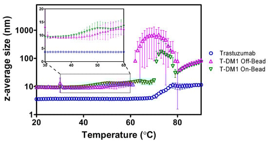 z-average size of trastuzumab (blue circle), Off-Bead (purple triangle), and On-Bead (green triangle) as a function of temperature measured by dynamic light scattering (DLS). Inlay shows the temperature of initial aggregation for Off-Bead and On-Bead. Data points represent average size ± standard deviation of triplicate values. Trastuzumab data was originally published in Gandhi et al. [16].
