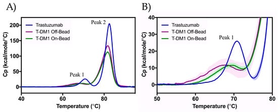 DSC thermograms provide useful insight into the thermal stability of the ADCs related to denaturation (Figure 5). We observed two main transitions: Peak 1 corresponds to CH2 domain unfolding and Peak 2 corresponds to the unfolding of the Fab region and CH3 domain [18]. Statistically significant decreases in the midpoint temperature of thermal transitions (Tm) were seen between trastuzumab and either ADC at both transitions (Table 1). The On-Bead and Off-Bead T-DM1 showed identical Tm,2 values (−0.9 °C lower than that of trastuzumab). While the Tm,1 value for the Off-Bead conjugate was significantly lower than that of the On-Bead sample, indicating greater stability of On-Bead in the CH2 domain.
