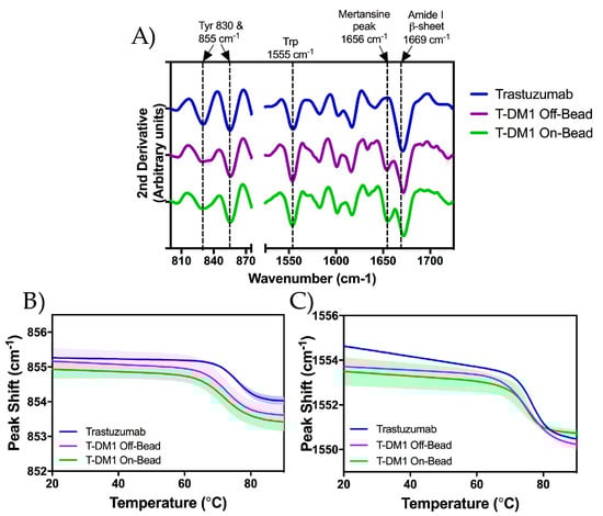Analysis of secondary and tertiary structures of trastuzumab (blue), Off-Bead (purple) and On-Bead (green) as measured by Raman spectroscopy. (A) 2nd derivative Raman spectra measured at 20 °C from 800 to 1725 cm−1. Correlating structures are labeled above the figure with dotted lines at the respective wavenumber; (B,C) Thermally induced peak shifts in designated structures. Tyrosine 855 cm−1 in panel B and tryptophan 1555 cm−1 in panel C. Standard deviation is represented by the shading around each line. Trastuzumab data was originally published in Gandhi et al. [16].