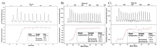 Calculated values for the dissociation constant (Kd), stoichiometry (n), enthalpy (ΔH), and entropy (ΔS) from the fitted data in Figure 7. No statistical significance was seen between any of the calculated values (p ≤ 0.05). Data shown as an average ± standard deviation of duplicate measurements.