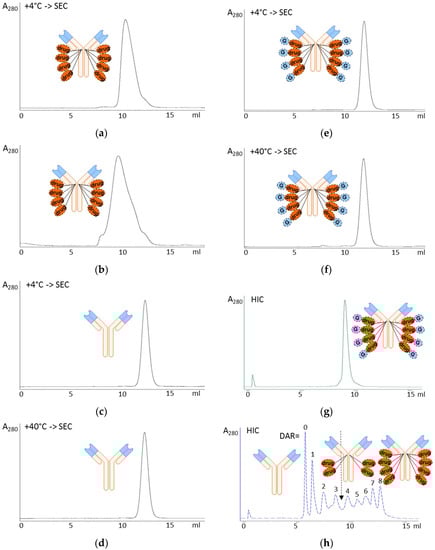 DAR = 8 ADCs were placed to heat stress conditions at +40 °C at a concentration of 4.6 mg/mL. The aggregation status was analyzed by size-exclusion chromatography (SEC-HPLC) on a 1.0 × 30 cm column of Superdex 200, in an isocratic run with 0.2 M potassium phosphate, 0.25 M potassium chloride, pH 7.0. Control ADCs were stored at +4 °C. Aggregated high-molecular weight components (HMWCs) eluted before the elution position of the non-aggregated control ADC and control naked antibody, and the relative molar proportions of the components were calculated based on integrated absorbance at 280 nm.