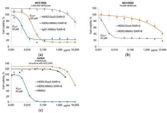 In vitro cytotoxicity of anti-HER2 ADCs against HER2-expressing cancer cell lines. (a) For high copy number HER2-expressing cells, both anti-HER2 DAR = 8 MMAU ADC and DAR = 2 duostatin-3 ADC showed high cytotoxic activity, while both anti-HER2 naked antibody and an isotype IgG control antibody-MMAU conjugate showed only no or low cytotoxicity, respectively. All experiments were performed in triplicate except for anti-HER2 naked antibody; (b) For low copy number HER2-expressing cells, the anti-HER2 DAR = 8 MMAU ADC had superior activity compared with DAR = 2 duostatin-3 ADC. Both experiments were performed in triplicate; (c) To demonstrate bystander kill activity of MMAU ADCs, non-HER2-expressing Jurkat cells were co-cultured with HCC1954 cells that express HER2, and viability of Jurkat cells was measured after incubation with fluorescence-assisted cell sorting (FACS)-based assay. The anti-HER2 DAR = 8 MMAU ADC showed bystander kill activity, while neither the anti-HER2 DAR = 2 duostatin-3 ADC nor the free MMAU payload had cytotoxic activity towards Jurkat cells. The results are from a single representative experiment. IC50 values are marked in the figure panels and they were determined using curve fitting by nonlinear regression as the concentration of the drug that causes 50% inhibition of cell viability compared to maximum inhibition. Error bars show the standard error of the mean, where applicable.