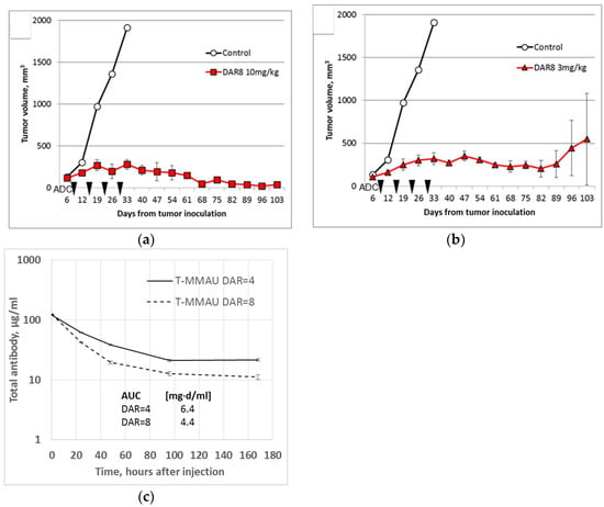 In vivo experiments. (a,b) EGFR+ HSC-2 tumor xenografts in mice were effectively treated with anti-EGFR DAR = 8 MMAU ADCs based on cetuximab. Mice were inoculated with tumor cells and treatment was given intravenously either with (a) 10 mg/kg or (b) 3 mg/kg ADC once weekly for four weeks (arrows). With the larger dose (a) the tumors shrunk permanently (follow-up of 100 days) and with the lower dose (b) the growth of the tumors was arrested in all but one mice (recurrence after 80 days). There were three mice in each treatment group. Error bars show the standard error of the mean. (c) Trastuzumab-MMAU ADCs (T-MMAU) were given to nude mice as single 10 mg/kg i.v. injection. DAR = 8 MMAU ADC showed 31% smaller area under curve (AUC) than DAR = 4 MMAU ADC. There were three mice in each treatment group. Error bars show the standard deviation.