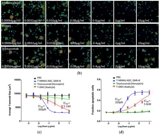 For a head-to-head comparison of the DAR = 8 MMAU ADC with a clinically approved ADC, Kadcyla®, we employed an in vitro 3D HER2 overexpressing gastric tumor PDX model GXA3067 (Figure 5) that more closely resembles the in vivo situation than monolayer culture [8]. In the 3D experiments, concentration series of trastuzumab (Herceptin®), T-DM1 (Kadcyla®) and trastuzumab-based DAR = 8 MMAU ADC were applied to the gastric cancer tumoroids (Figure 5b), and their effect on tumoroid size (Figure 5c; as a measure of cytotoxicity) and fraction of apoptotic cells (Figure 5d) were quantitated. Both ADCs inhibited tumoroid growth and induced apoptosis in the in vitro 3D PDX model. However, based on the IC50 values the DAR = 8 MMAU ADC was 10–18× more effective, respectively, than T-DM1 (Figure 5c,d). The anti-HER2 ADC T-DM1 comprises an anti-tubulin payload DM1 with an average DAR = 3.5 [12].