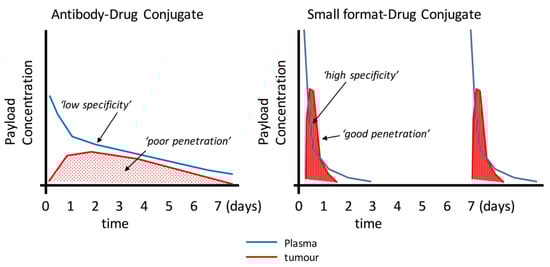 Schematic illustration of the potential mechanistic and pharmacokinetic differences between an ADC (e.g., from [110] and small format-drug conjugate. Many reports have demonstrated the uptake and clearance properties of large and small targeting agents. This figure proposes how smaller formats my bring certain advantages such as faster plasma clearance and improved penetration. Smaller formats may require more frequent doses as shown here.