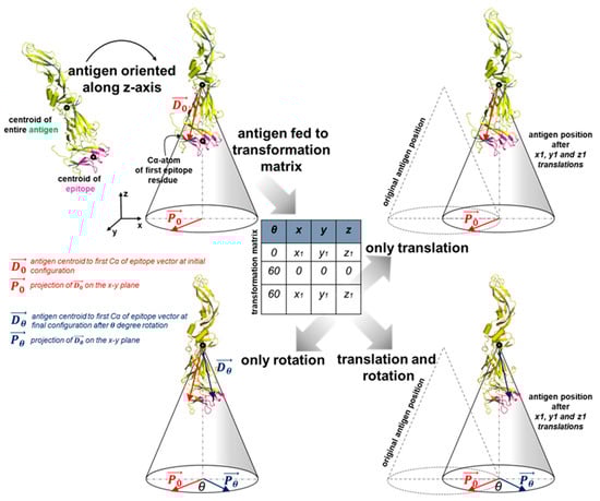 Following the rotation, OptMAVEn-2.0 generates an ensemble of antigen positions using a grid search (Figure 2). This step has been made significantly more efficient relative to OptMAVEn. An antigen-binding site is defined as the virtual box (obtained by inspecting 750 antigen-antibody binding regions) in which the x, y, and z coordinates of the epitope’s centroid are within the ranges [−10 Å, 5 Å], [−5 Å, 10 Å], and [3.75 Å, 16.25 Å], respectively. This box is partitioned into a grid (default x, y, and z intervals are 2.5, 2.5, and 1.25 Å, respectively). Furthermore, the antigen is rotated around the z axis to increase conformational sampling (the default is 6 rotations in increments of 60°). Hence, each antigen position can be represented as a so-called position vector consisting of the epitope centroid (x, y, and z coordinates) and the rotation angle around the z axis (). The default settings lead to 6 × 7 × 7 × 11 = 3234 positions. OptMAVEn-2.0 introduces a precise definition of for peptide antigens, which was missing in OptMAVEn. Let be the vector extending from the centroid of the antigen to the coordinate of the Cα atom of the first residue in the antigen. Then is defined as the angle between the positive x-unit vector () and the projection of onto the x-y plane. Using the relationship between angle and dot product, , which leads to .