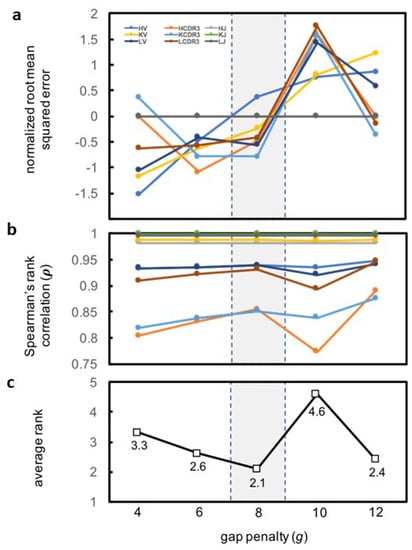 The gap penalty g is used to compute sequence alignment distances , which are embedded and used to compute pairwise distances . Thus, and RMSE (which depend on and ) depend on g. A close to unity indicates that the relative order of distances was preserved during the embedding, and a RMSE close to zero indicates that the distances themselves were minimally perturbed. The optimal gap penalty (g) would maximize and minimize RMSE for each MAPs category. To identify this optimal g, we tested five values of g: 4, 6, 8, 10, and 12. Each g was used to generate a similarity matrix S and an alignment matrix Dalign for each category of parts. The distances in Dalign were embedded with DGSOL, and pairwise distances Dembed between the embedded coordinates were computed. Then, (Figure 4a and Supplementary Table S1) and RMSE (Figure 4b and Supplementary Table S2) were computed using Dalign and Dembed. For each MAPs part category (HV, LV, and so on), we ranked the different g values in terms of the corresponding ρ (highest ρ yields rank 1 for the corresponding g and vice-versa) and of RMSE (lowest RMSE yields rank 1 for the corresponding g and vice-versa) (Table 1). Therefore, the rank of each g indicates how well the distances in Dalign could be embedded while preserving both relative and absolute distances. HJ, LJ, and KJ were excluded from this analysis because these parts contain no residue number gaps in the IMGT numbering; for these parts, Dalign and Dembed do not depend on g. We found that g = 8 had the best average rank (2.1) (Figure 4c) and thus used g = 8 hereafter. However, the user has the option of selecting a different g from among the levels tested.