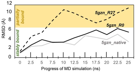 We assessed the long-term stability of each of the three antigen-antibody complexes by calculating, once every 2.5 ns, the RMSD of the antigen with respect to the antigen at the beginning of the production run (i.e., time 0 ns). In order to analyze the stability of the antigen-antibody complex for the de novo designed antibody, we first identified the binding interface residues and tracked their fluctuations during the course of the 25 ns production run. Residues distal to the interface were neglected because unordered loop regions would contribute to larger root mean square deviations (RMSDs) even though the interface might be fairly stable. The antibody residues that are a part of the binding interface were aligned to their starting conformation (at 0 ns) at the end of every 2.5 ns of the 25 ns run. Then the heavy-atom RMSD of the antigen residues within the interface was computed (Figure 6). RMSDs of the native complex and 5 gzn_R0 were similar and remained below 6 Å in every frame examined, indicating that these complexes were stable throughout the entire simulations, according to a previous definition of stable binding by Poosarla et al. [52]. RMSD of 5gzn_R27 exceeded 6 Å but did not exceed 12 Å, indicating that the antigen remained partially bound [52]. Figure 7 shows the key electrostatic interactions (polar and salt bridge) seen in the 5gzn_native, 5gzn_R0, and 5gzn_R27 designs.