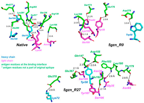 The key interactions at the antigen-antibody interface post-MD simulations for native, 5gzn_R0, and 5gzn_R27 have been depicted. The light and heavy chain residues are shown as magenta and cyan sticks, respectively, while antigen residues are depicted as green sticks.
