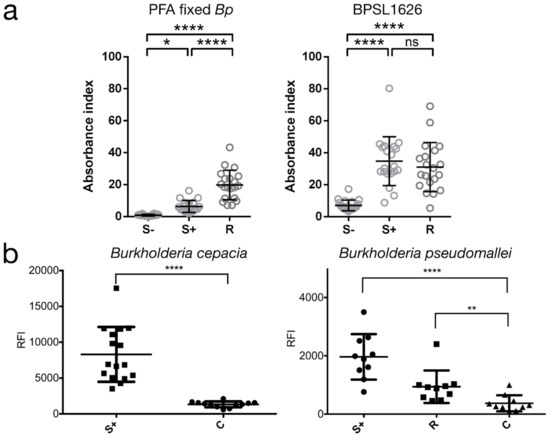 BPSL1626 is recognized by plasma IgG antibodies from seronegative, seropositive and melioidosis recovered individuals. (a) Plasma samples from seronegative (S−, N = 20), seropositive (S+, N = 20), or melioidosis recovered individuals (R, N = 20) were probed on uncoated, 107 PFA fixed Bp, or BPLS1626 coated ELISA plates. Human IgGs bound to the ELISA plates were detected. The absorbance index was calculated by (O.D.test − O.D.uncoated)/O.D.uncoated. Results are shown as an individual dot plot line at mean with S.D. Statistical difference was determined using one-way ANOVA with Tukey’s multiple comparisons test; ns, non-significant, * p < 0.05, **** p < 0.0001; (b) Scatter plots reporting individual and mean immunoreactivity with S.D. of seropositive (S+) and control individuals. Results of the unpaired t Test for B. cepacia complex infection (left panel) and the unpaired t Test for B. pseudomallei infection (right panel). Seropositive patient groups are labeled as S+; recovery patients are labeled as R; seronegative control group is labeled as C. ns = not significant. Significant: p < 0.05; * = p < 0.05; ** = p < 0.01; *** = p < 0.001; **** = p < 0.0001.