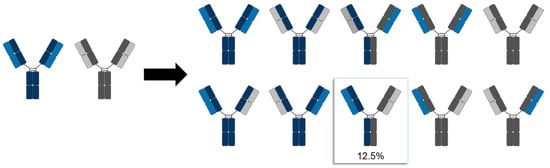Schematic illustration of the bsAb chain association issue. Upon co-transfection of a host-cell with plasmids encoding for two different heavy and two different light chains, ten unique chain pairings can occur. The desired bsAb will appear with a statistical probability of 12.5%.