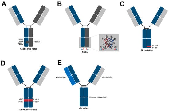 In addition to the described technologies, a variety of other strategies can be found in literature, such as electrostatic steering approaches [], Fab-arm exchange [,,] and cleavable leucine zipper [], which are comprehensively described elsewhere [].