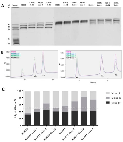 We have generated 3 κλ bodies (K2O30, K2O35 and K2O41) targeting human CD47 and human mesothelin (MSLN). All three bsAbs incorporate the same anti-CD47 arm (K2) containing a kappa light chain but different anti-MSLN arms (O30, O35 and O41) containing different lambda light chains based on different variable germline genes (Table 1). The common heavy chain and respective light chains of these candidates were transiently co-expressed in mammalian cells using a single plasmid with three independent promoters. After purification of all IgG forms (IgGκκ, IgGκλ, IgGλλ) from the culture supernatant via affinity chromatography, the polypeptides were separated on an Agilent Bioanalyzer. This analysis revealed significantly different light chain contents for each candidate, with 20%, 30% and 38% of kappa light chain incorporated into the different IgG forms of K2O30, K2O35 and K2O41, respectively (Figure 1). Although for these candidates the lambda light chain was more abundant, this is not a general phenomenon as higher kappa light chain content has also been observed for different κλ bodies [14]. Isoelectric focusing gel analysis confirmed the over-representation of the lambda chain for K2O30, K2O35 with high intensity bands corresponding to the monospecific IgGλλ. In contrast, for K2O41 the bands corresponding to IgGλλ and IgGκκ were of comparable intensity, while the bispecific IgGκλ was the most intense, as expected in a situation of more balanced light chain expression (Figure 2A). The IgG form distribution was confirmed and quantified by hydrophobic interaction chromatography (HIC) for K2O30 and K2O41 (Figure 2B; Table 1) but not for K2O35 as the method did not allow for sufficient separation of the three forms.