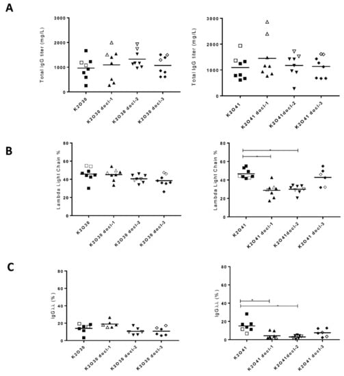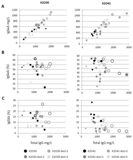 Representation of different parameters analyzed in the supernatants of stable CHO pools K2O30, K2O41 and their respective codon de-optimized variants. (A) Correlation between total IgG and IgGκλ titers. (B) Representation of total IgG titers, abundance of IgGκλ and IgGκλ titers. (C) Representation of total IgG titers, abundance of IgGλλ and IgGκλ titers. In B and C the size of the circles corresponds to the IgGκλ titer. Open circles correspond to the pools represented by open symbols in Figure 3. Circles in dotted lines correspond to the average of all pools for a given construct.