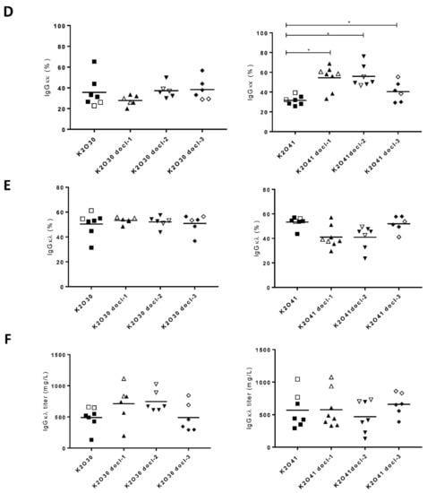 Analysis of IgG ratios and yields in the supernatant of stable CHO pools transfected with K2O30, K2O41 and their respective codon de-optimized variants. Each symbol represents an independent pool. Open symbols indicate the two highest IgGκλ producing pools for each variant. (A) Total IgG titers in the supernatants. (B) Percentage of lambda light chain determined using the Agilent Bioanalyzer 2100. (C–E) Percentage of different IgG forms in total IgG after one step of purification analyzed by HIC-HPLC. (F) IgGκλ titers in the supernatants. (*) represent a p value of < 0.5 using one way analysis of variance.