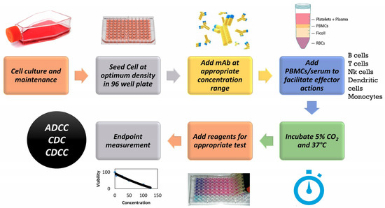 General Methodology for an in vitro assay to detect toxicity of monoclonal antibody (mAb) based therapeutics. PBMCs: Peripheral Blood Mononuclear Cells. ADCC: Antibody dependent cytotoxicity. CDC: Complement dependent cytotoxicity. CDCC: Complement dependent cellular cytotoxicity, NK: Natural Killer, RBCs: Red Blood Cells