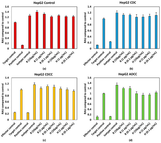 (a) Control conditions without effector cells/serum (b) CDC (c) CDCC, and (d) ADCC assay results of rituximab and Trastuzumab based on the WST-1 assay. Results represent pooled responses from four donors (n = 4). All values are expressed as Relative Absorbance Units (RAU) of control (mean ± SE). R: Rituximab and H: Trastuzumab. Positive control is 5% (v/v) of absolute ethanol. HepG2: hepatocarcinoma cell line.