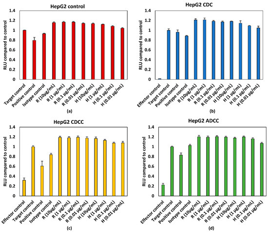 (a) Control conditions without effector cells/serum, (b) CDC, (c) CDCC, and (d) ADCC assay results of rituximab and trastuzumab based on the ATP content compared to control in HepG2 cells exposed to mAbs. Results represent pooled responses from four donors (n = 4). All values expressed as relative luminescence units (RLU) compared to control (mean ± SE). R: Rituximab and H: Trastuzumab. Positive control is 5% (v/v) of absolute ethanol.