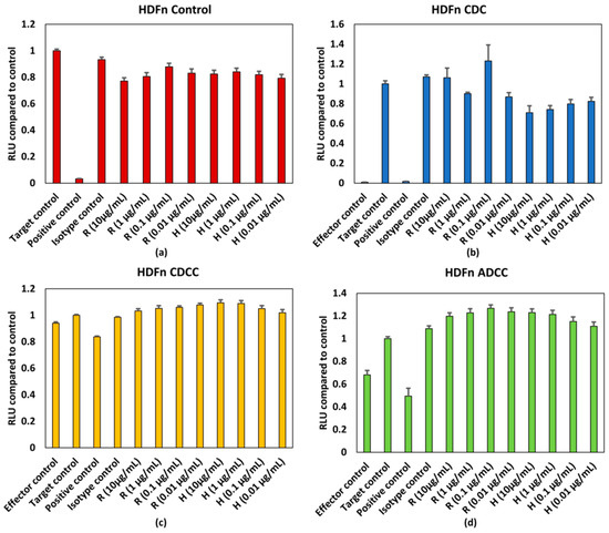 (a) Control conditions without effector cells/serum, (b) CDC, (c) CDCC, and (d) ADCC assay results of rituximab and Trastuzumab based on the ATP content compared to control in HDFn cells exposed to mAbs. Results represent pooled responses from four donors (n = 4). All values expressed as relative luminescence units (RLU) compared to control (mean ± SE). R: Rituximab and H: Trastuzumab. Positive control is 5% (v/v) of absolute ethanol.