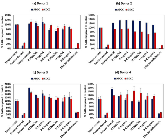 Intrinsic variation in responses owing to donor variability in ADCC and CDCC assay results of rituximab and Trastuzumab based on the ATP content compared to control in HepG2 cells exposed to mAbs for (a) Donor 1, (b) Donor 2, (c) Donor 3 and (d) Donor 4 All values expressed as relative Absorbance Units (RAU) compared to control (mean ± SE). R: Rituximab and H: Trastuzumab. Positive control is 5% (v/v) of absolute ethanol.