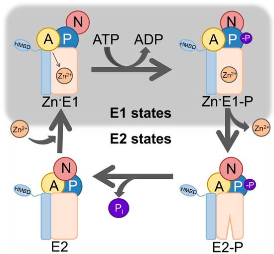 The protein superfamily of P-type ATPases is formed by phylogenetically related pumps that actively transport ions and lipids across biological membranes of prokaryotes and eukaryotes [1] at the expense of adenosine triphosphate (ATP). They are divided in five subfamilies (PI-PV) based on sequence similarity and transport specificity [2]. PI-ATPases transport cations, with the PIB-subclass being specific for heavy metals such copper and zinc. Noteworthy members of the other subfamilies include the calcium and sodium-potassium ATPases of PII and the proton ATPase of PIII. The focus here is on class 2 PIB-ATPases, PIB-2-ATPases, which comprises zinc-transporting P-type ATPases. These ATPases are relatively poorly characterized from a mechanistic and functional point of view, and only E2 states (metal-free) have been resolved structurally [3]. One reason is that metals such as zinc render these targets unstable, and another that there are no identified compounds that can bind specifically and exclusively to several specific states (including metal bound E1 conformations) of PIB-ATPases. The overall structural architecture is conserved in all P-type ATPases, with four domains [4]: The soluble domains, P (phosphorylation), N (nucleotide binding), and A (actuator), and the M domain in the transmembrane region. The P domain contains the highly conserved aspartic acid—lysine—threonine—glycine—threonine (DKTGT) motif with the catalytic aspartate that is targeted by ATP stimulated autophosphorylation. The N domain is responsible for orienting the ATP towards the P domain. The A domain comprises the conserved threonine—glycine—glutamic acid (TGE) loop, which allows for dephosphorylation of the catalytic aspartate in the P-domain and the M-domain is composed by a variable number of helices that enclose membranous ion-binding site(s) that are critical for transport. In addition, zinc transporting PIB-2-ATPases possess one or more soluble subfamily-specific domains known as heavy metal-binding domains (HMBDs), whose function remains unclear [5]. These domains work in a tightly coupled manner in order to achieve transport, and the reaction cycle is summarized in the so called Post-Albers scheme [6,7,8] (Figure 1).