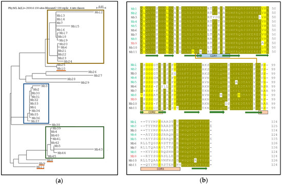 Sequence analysis of the identified Nbs. (a) Phylogenetic tree of 45 Nb sequences: The three main families of Nbs are highlighted by colored boxes: The first family (blue box) includes Nb1-2-3, the second family (green) includes Nb4-5, the third family (ochre) is composed of two subfamilies, which include Nb6 and Nb7, while Nb8-9-10-11 were sampled as outliers. (b) Sequence alignment of the 11 selected Nbs containing the predicted secondary structure (β-sheets are shown as green arrows), the complementarity-determining regions (CDR1 to 3), and the conserved disulphide bond (orange line). Identical (90% threshold) residues are in dark yellow while similar amino acids in light yellow. Nbs that bind to SsZntA, but do not inhibit activity, are represented with a green name (Nb1-2-4-5-8), while in red, the Nb that significantly inhibits ATPase activity (Nb9). The Nbs that precipitated during purification (Nb3) or that caused precipitation of SsZntA (Nb6-7-10-11) are represented in black.
