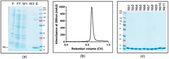 Nanobody purification. Samples from purification of Nb1 are representative of all the assessed Nbs. (a) Samples from insoluble fraction (pellet, P), flow-through of the IMAC (FT), first and third wash of Ni2+-beads (W1 and W3, respectively), and eluted fraction containing Nb1 loaded on Coomassie-stained SDS-PAGE. (b) SEC (24mL, Superose75) elution profile: The main peak elutes at 0.6 CV with only minor contaminants. (c) Coomassie-stained SDS-PAGE of SEC-purified Nbs: Nbs have a molecular weight of approximately 13.5 kDa.