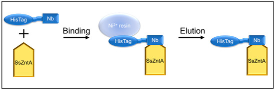 Affinity chromatography binding assay. SsZntA is treated with TEVp to remove the HisTag, in this way it cannot bind to a Ni2+ beads, while the HisTagged nanobody can. The binding was assessed by incubating HisTag-free SsZntA with HisTagged Nb and loading them to an Ni-NTA column. When SsZntA forms a complex with the Nb, it indirectly binds to the Ni2+ beads (via the Nb’s HisTag) and can be eluted from the Ni2+-immobilized resin. N.B. All the representations are out of scale for clarity.