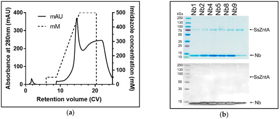 Nbs were incubated with SsZntA and subjected to SEC to assess complex formation. We tested the binding in a small-scale size-exclusion column (2.4 mL) and in a medium-scale column (24 mL). The latter was used only on Nbs, which proved to bind to SsZntA in order to obtain a more stable signal and improve the signal-to-noise ratio. The chromatogram reported in Figure 6a is acquired from the medium scale column obtained from Nb1 and is representative of those obtained from Nb2-4-5-8-9 (results not shown), and shows the first peak at 0.6 CV (14.5 mL) containing the SsZntA-Nb complex and the second peak at 0.85 CV (20.5 mL) containing unbound Nb. The overlaying dashed and dotted lines represent the chromatograms obtained from Nb1 and SsZntA, respectively, under the same conditions. As summarized in Table 1, six Nbs (Nb1-2-4-5-8-9) displayed co-elution, suggesting SsZntA-Nb interaction. Nb6-7-10-11 caused precipitation of SsZntA and hence these Nbs were not tested in subsequent assays.