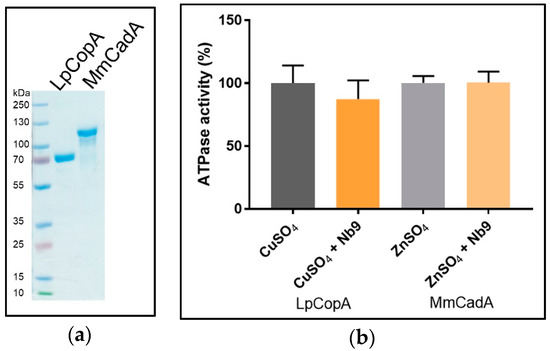 We used the Baginski assay to access Nb-induced inhibition of SsZntA, which estimates the amount of released inorganic phosphate (Pi) associated with the catalytical cycle (ATP turn-over, 1 mole Pi equals 1 mole of transported zinc). Different batches of Nbs were tested for inhibitory activity at a molar ratio of 1 (SsZntA) to 2 (Nb), corresponding to 8 µM SsZntA and 16 µM Nbs, yielding the results shown in Figure 10a: Wild-type SsZntA without added Nb displays a specific activity of 885 ± 87 nmol Pi mg−1 min−1, which is comparable to the activity previously reported [18]. Nb9 reduces the ATPase activity to around 50% of wild-type, showing a significant inhibition with a p value < 0.0001 (Dunn’s multiple comparison test). The inhibition on the ATPase activity by the other Nbs is non-significant at the concentrations tested. We included the phosphate analog, aluminum fluoride (AlF3), as a control of the ATPase inhibition assay at two different concentrations: 1.6 µM (as the Nbs) and 2 mM (previously reported [3] working concentration). AlF3 does not affect ATPase activity at 1.6 µM, showing that the affinity for SsZntA of Nb9 is higher than that of AlF3. In Figure 10b, a titration experiment of Nb9 with different molar ratios is reported: Nb9 inhibits ATPase activity of SsZntA when present at least at a molar ratio 1:1 (SsZntA:Nb9) and has the maximum inhibitory effect (at about 50%) at the molar ratio of 1:3 (SsZntA:Nb9). To assess Nb9 specificity, it was further tested against CopA from Legionella pneumophila (LpCopA): A member of the same subfamily as SsZntA (PIB-type, 34% identity to SsZntA), but transporting Cu+ instead of Zn2+, and against CadA from Mesorhizobium metallidurans (MmCadA); a Cd2+ and Zn2+-transporting ATPase from the same subclass as SsZntA (PIB-2-type, 53% identity). LpCopA and MmCadA were purified similarly to SsZntA and yield highly pure protein (Figure 11a). As shown in Figure 11b, Nb9 did not inhibit ATPase activity for any of the two proteins, suggesting that Nb9 is specific for SsZntA.