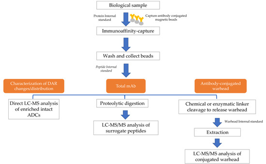 - Wang, J.; Gu, H.; Liu, A.; Kozhich, A.; Rangan, V.; Myler, H.; Luo, L.; Wong, R.; Sun, H.; Wang, B.; et al. Antibody-drug conjugate bioanalysis using LB-LC-MS/MS hybrid assays: strategies, methodology and correlation to ligand-binding assays. Bioanalysis 2016, 8, 1383–1401. [Google Scholar] [CrossRef] [PubMed]