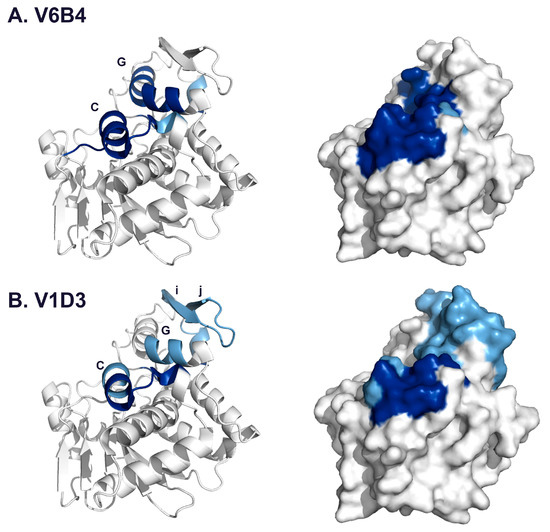Epitope localization for two subcluster 3.1 VHHs. HX protection categories shown in Figure 4 were mapped onto the crystal structure of RiVax for (A) V6B4 and (B) V1D3. The most relevant secondary structure elements, α-helices C and G and β-strands i and j, are labeled. The color shading corresponds to strong (deep blue), intermediate (light blue) or no significant protection (gray), as represented in Figure 4.