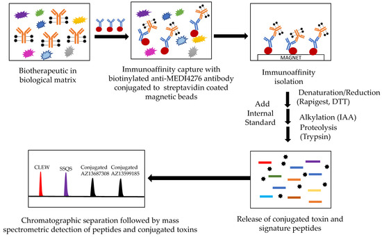 7]. Following the immunocapture, the surrogate analyte (i.e., the payload/warhead (in the conjugated drug assay) or the signature peptide (in the total antibody assay)) is released using enzymatic or chemical treatment and detected using mass spectrometry [