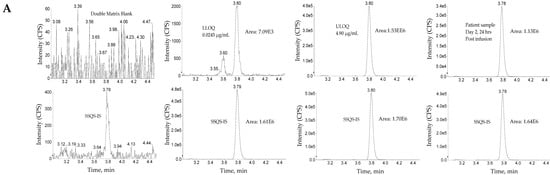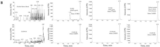 In this assay, the HPLC system consisted of a Binary Solvent Manager and an Acquity UPLC I-Class Autosampler (Waters, Milford, MA, USA). Acquity UPLC BEH C18 VanGuard, 2.1 mm × 5 mm, 1.7 µm and Acquity BEH C18, 2.1 mm × 50 mm, 1.7 µm column (Waters, Milford, MA, USA) were used as a trapping column and an analytical column, respectively. Both trapping and analytical pumps used 10 mM Ammonium bicarbonate as mobile phase A and acetonitrile as mobile phase B. The analytical column and the trapping column were maintained at 60 °C and 65 °C, respectively.