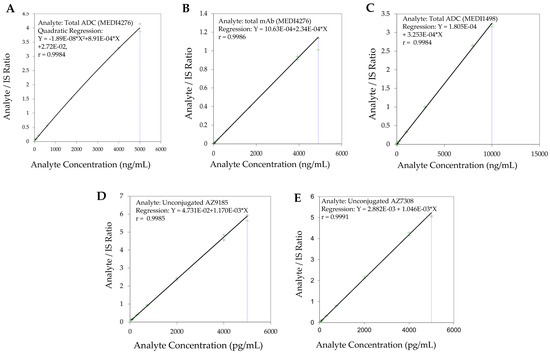 2 weighted, least-squares regression algorithm was used to plot the peak area ratio of total ADC to its internal standard versus concentration. The quadratic behavior of the curve was attributed to response saturation in the mass spectrometric detector, due to the high signal response of the conjugated payload (the molar concentration of the conjugated payload was twice the molar concentration of the antibody as MEDI4276 has a DAR of 4).