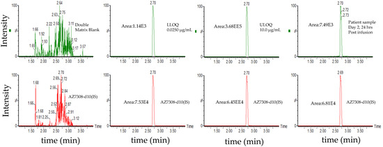 Antibody-drug conjugate MEDI1498 has the same antibody and linker molecule as MEDI4276. The only difference between the two ADCs is the warhead. In MEDI1498, AZ13599185 is replaced with its deacetylated form (AZ13687308). The assay design used for measuring total ADC of MEDI1498 was same as the hybrid LC-MS/MS assay for MEDI4276. As the antibody in the MEDI1498 is same as MEDI4276, the biotinylated anti-MEDI4276 idiotypic antibody was used as the capture reagent. After washing, the captured proteins are denatured using RapiGest solution, reduced using DTT, alkylated using iodoacetic acid, and digested with trypsin. The conjugated toxin was used as the surrogate analyte in the total ADC. The freed conjugated AZ13687308 was measured as the surrogate analyte for the measurement of total ADC (MEDI1498). AZ13687308-d10 was used as the working standard in this assay. In comparison to the MEDI4276 total antibody and total ADC assay, the sample aliquot volume was reduced from 25 µL to 20 µL, as well as the injection volume was reduced from 25 µL to 20 µL to avoid response signal saturation at the detector.